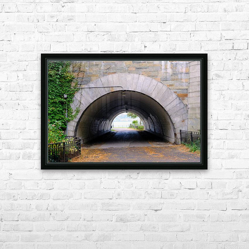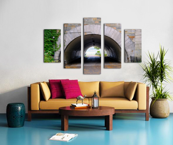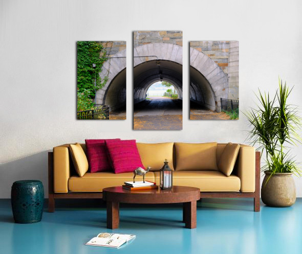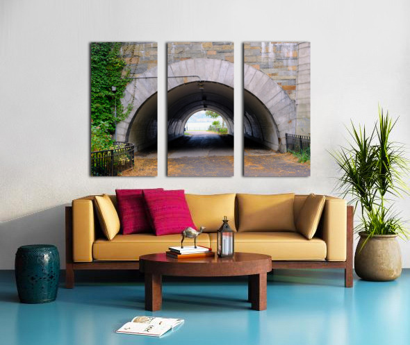 Riverside Park View of Twin Towers in New Jersey. Riverside Park Collection. With its strong architectural curve and quiet tone, this image balances form and feeling. The view beyond the tunnel glows with soft light, offering the suggestion of space, time, and a peaceful destination. A beautiful fit for spaces designed to inspire focus and calm.