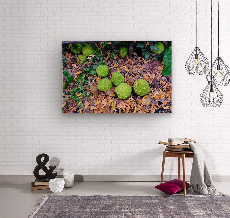 Riverside Park Collection. A cluster of Osage oranges rests among crisp, fallen leaves, creating a serene and slightly whimsical autumn composition. The image draws attention to nature’s overlooked details. As wall décor, it offers a grounded, meditative vibe, ideal for adding texture and seasonal character to your home or office.
