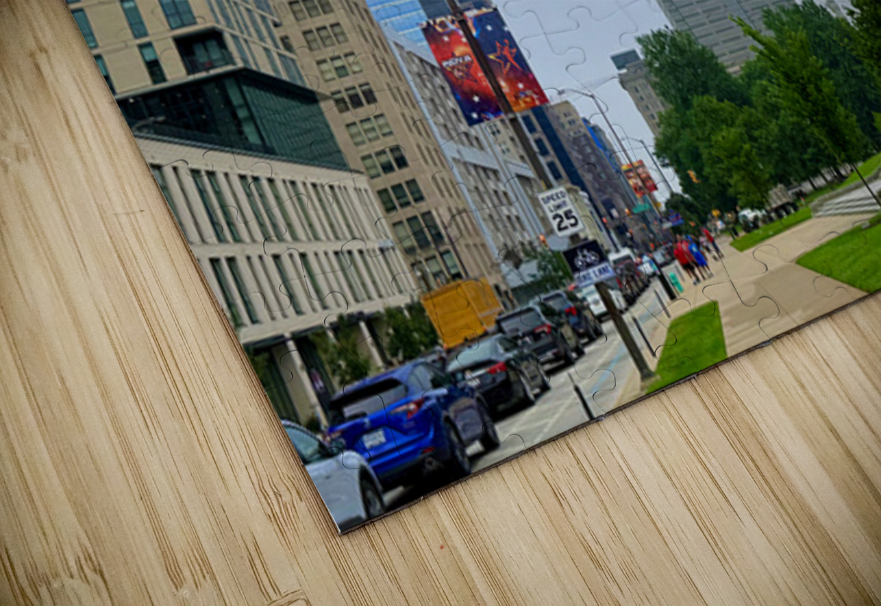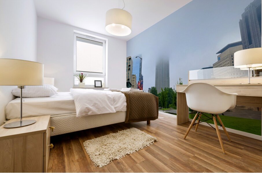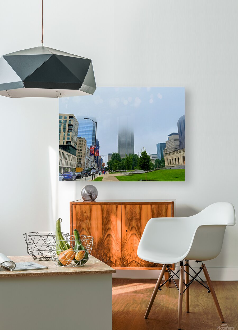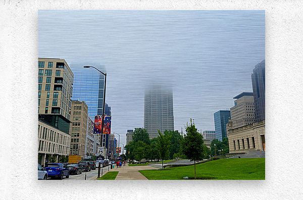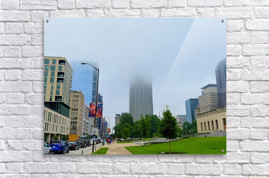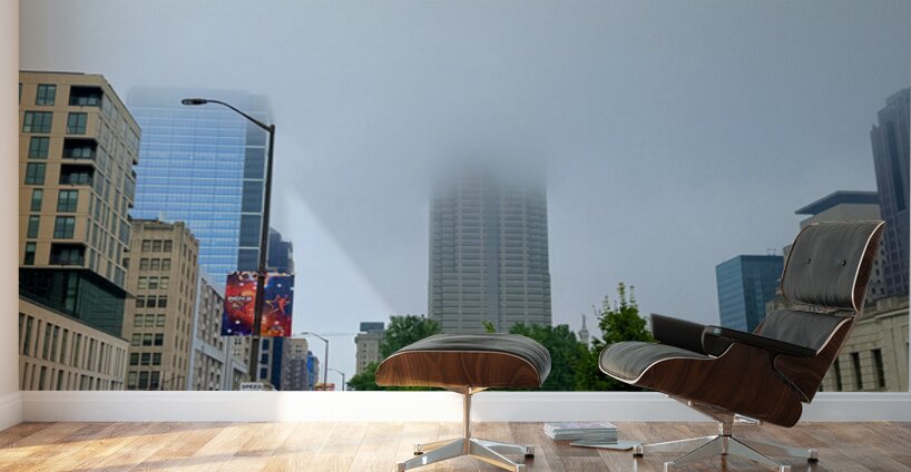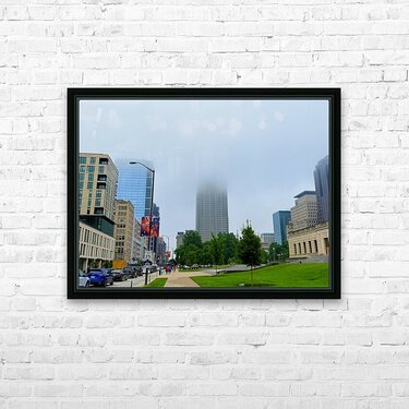 Captures a morning walk through a bustling city street, with a towering skyscraper partially hidden by low-hanging fog. This atmospheric blend of urban geometry and soft mist makes for a meditative wall art piece, perfect for those who appreciate urban serenity.