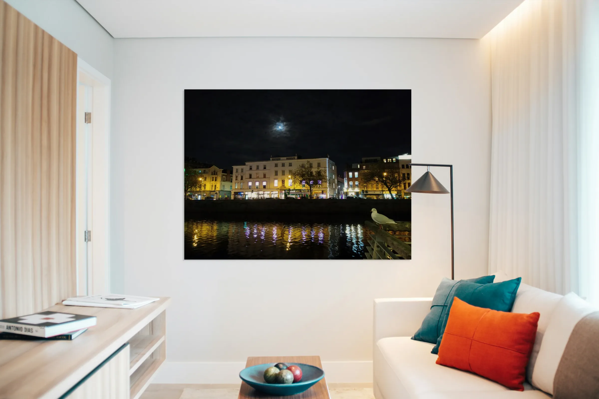Dreams of Dublin Series. The hustle and bustle of Ireland's business center along River Liffey glimmers peacefully at night. This little seagull pensively looks up to the glimmer of moonlight that peeks through the rolling clouds.